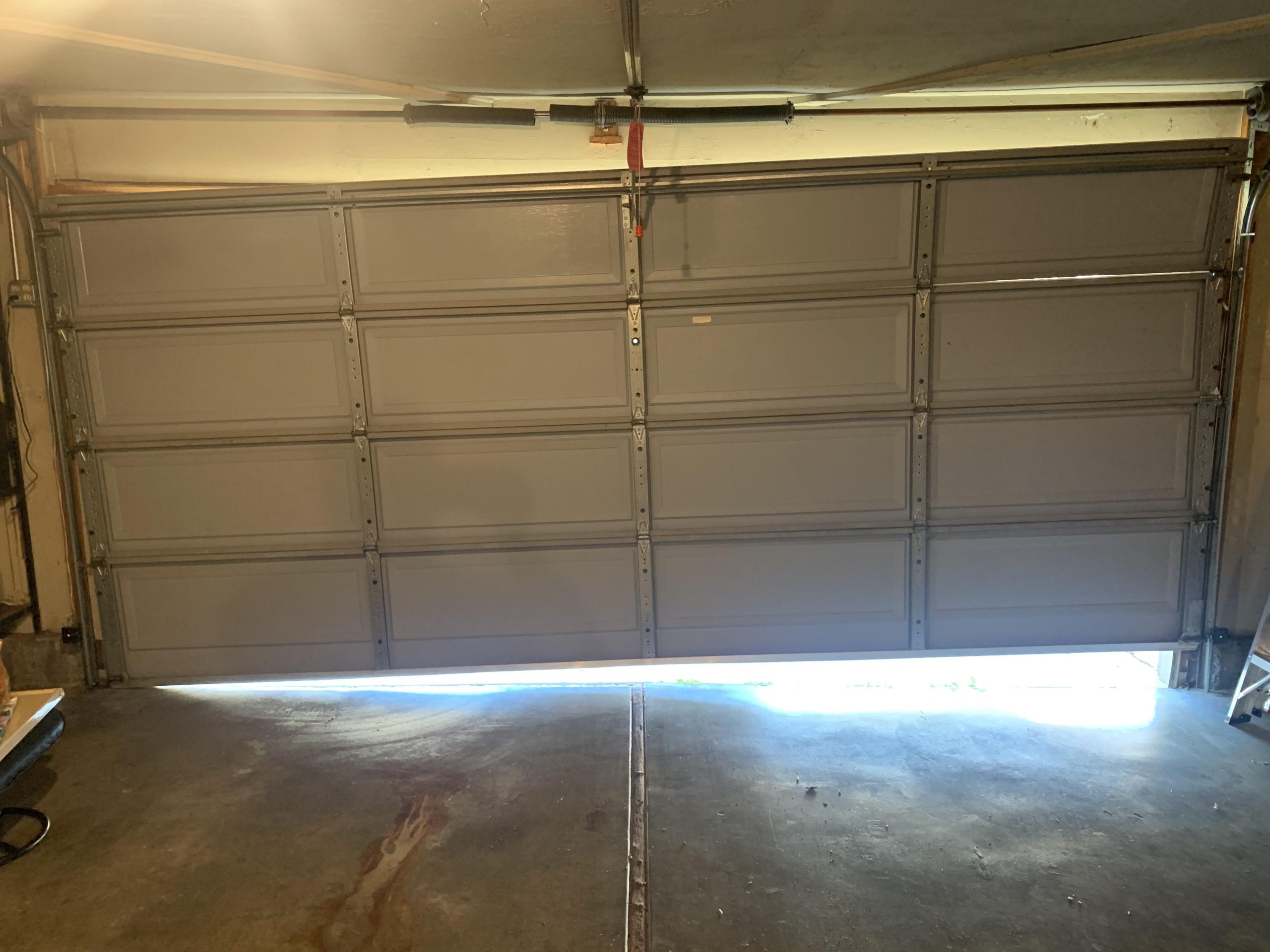- Testing reversal response using a 2×4 board laid flat under the door to confirm auto-reverse function.